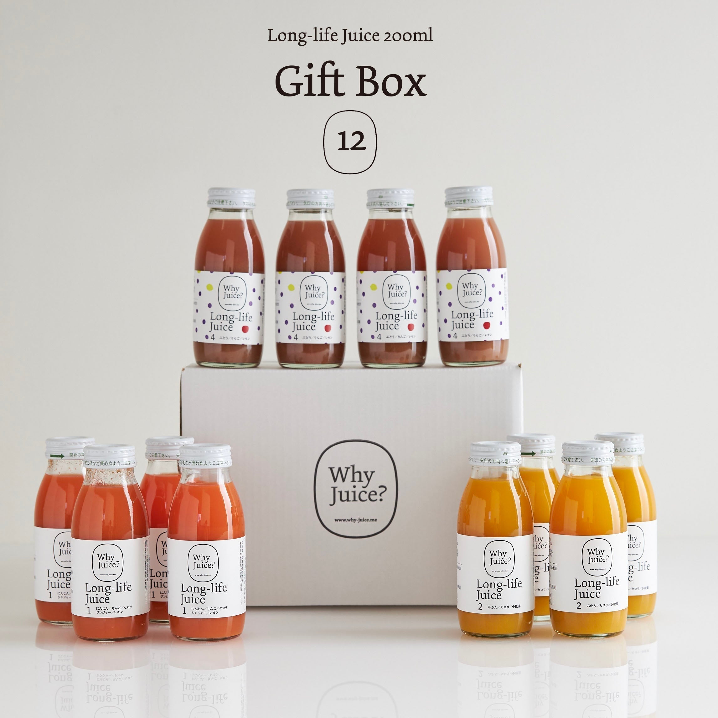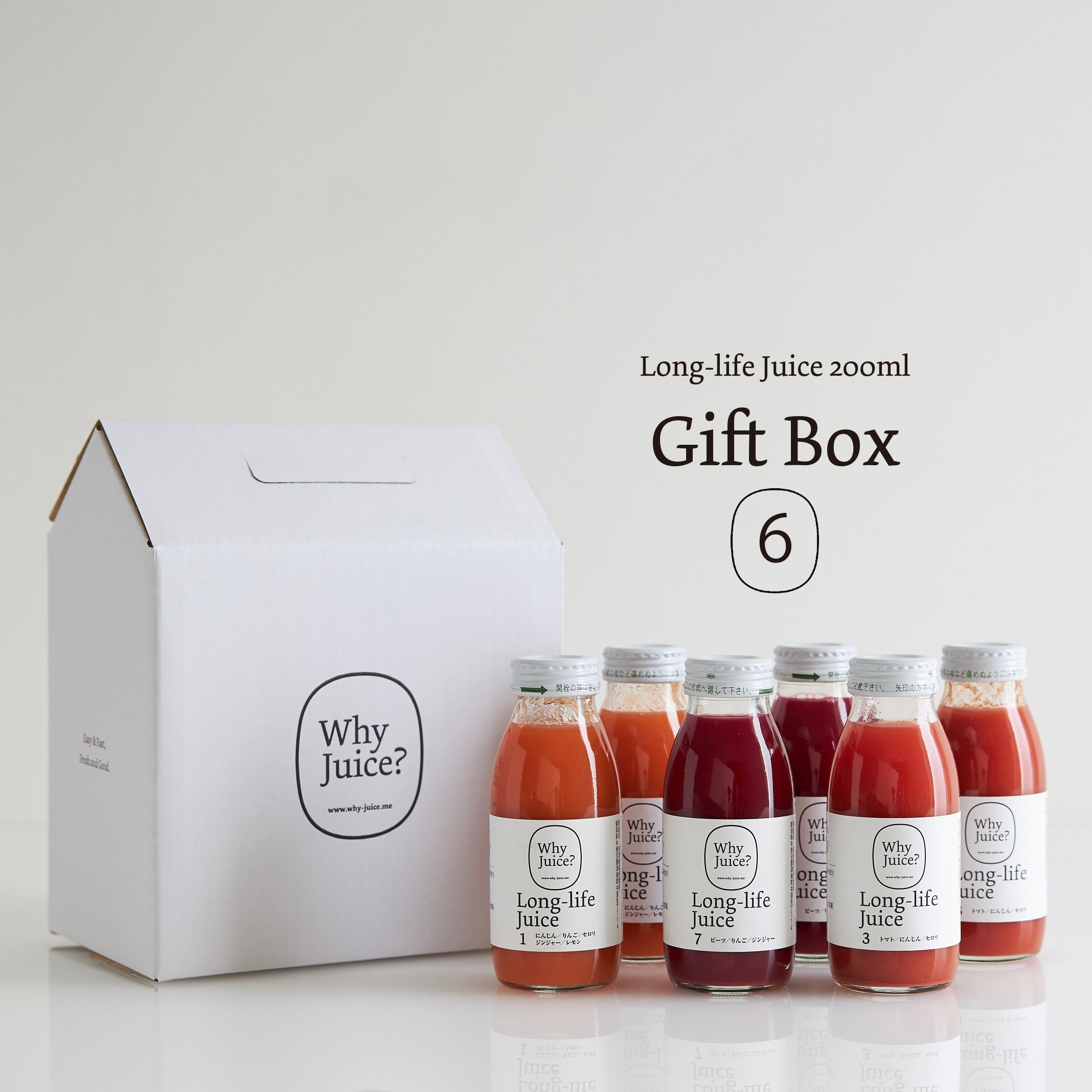 オリジナルのギフトボックスに入ったLong-life Juice6本セット。